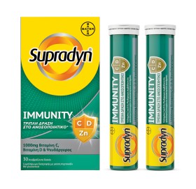 Το Bayer Supradyn Immunity C, D & Zn είναι ένα συμπλήρωμα διατροφής σε αναβράζουσα μορφή που στοχεύει στην υγεία και τη φυσιολογική λειτουργία του ανοσοποιητικού σας συστήματος. Έτσι σας προσφέρει τόνωση και συντελεί στη μείωση του αισθήματος κόπωσης που μπορεί να αισθάνεστε λόγω των έντονων ρυθμών της καθημερινότητας.