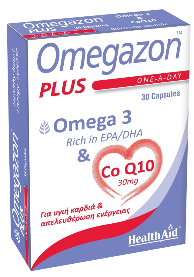 Το Omegazon Plus της HealthAid αποτελεί μια πρωτοποριακή σύνθεση από υψηλής καθαρότητας Νορβηγικά ιχθυέλαια, πλούσια σε Ω3 (EPA/DHA) και Συνένζυμο Q10, συνδυάζοντας τις ευεργετικές ιδιότητες και των δύο συστατικών όσον αφορά την φροντίδα και την τόνωση της καρδιάς, του κυκλοφορικού και του μυϊκού συστήματος.